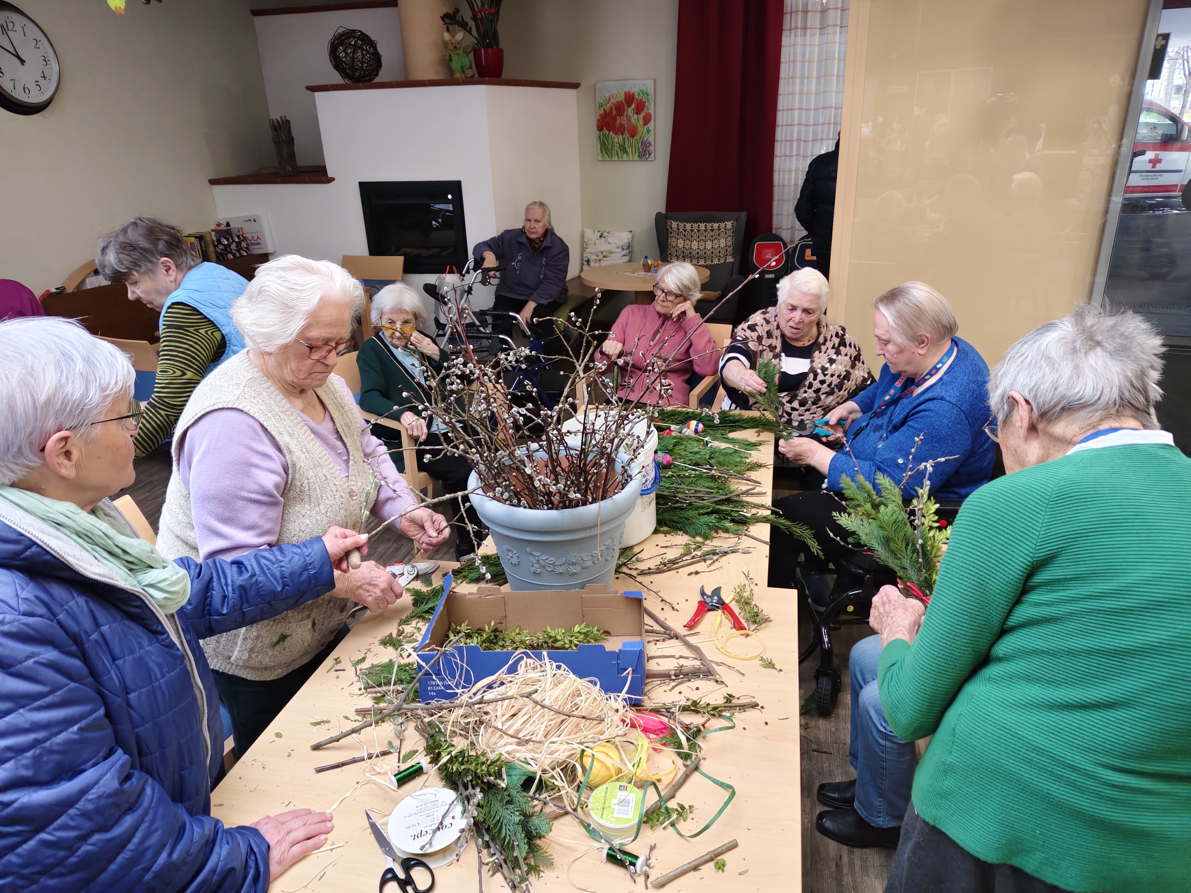 Zahlreiche fleißige Bewohnerinnen packten tatkräftig mit an, sodass insgesamt rund 45 Palmbuschen gefertigt werden konnten.